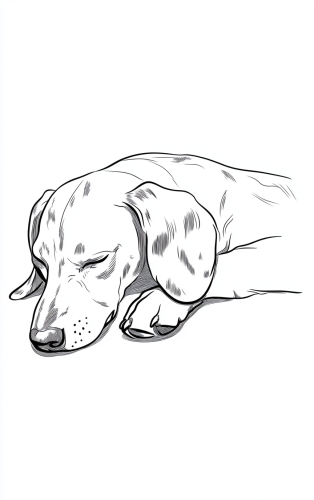 use a loose Studio Ghibli style to create a minimalist black-and-white line art drawing of a napping dachshund. the dachshund is white with a few spots. Include white background --ar 5:8