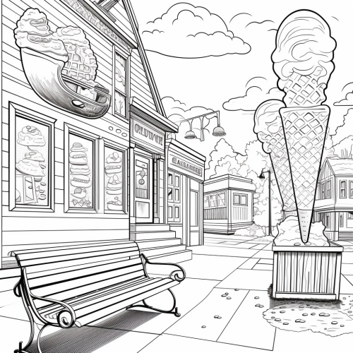 kids coloring page, black and white, no shading, bold clean lines, cartoon style, ice cream cones
