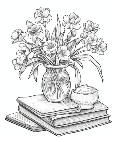 coloring page for kids, A table with flowers in a vase and a book next to it, thick line, low detailm no shading --ar 9:11