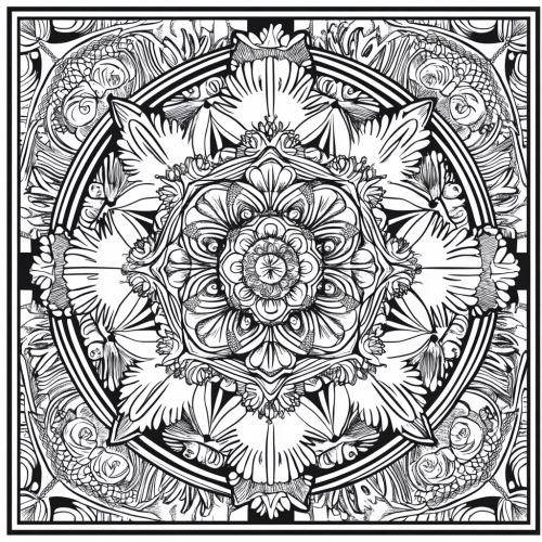 Black and white detailed and intricate mandala coloring page, featuring complex geometric patterns and symmetrical designs. Include a variety of shapes such as circles, triangles, and floral motifs. The lines should be crisp and clear, with a balance of large areas and small, intricate details. The design should evoke a sense of peace and meditation, with a spiritual or Zen-like quality.