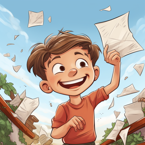 A small cartoon character that will serve as the avatar of the main character. I would like the character to appear in 3 different positions in one image: Jumping and laughing Thinking Solving math problems Worried and pondering. Distinctive features: a boy around 15 years old, with brown hair, large blue eyes, wearing glasses, smiling, in a red t-shirt and blue pants - a math student. The character should be caricatured, with a big head and small legs, in a Pixar-style