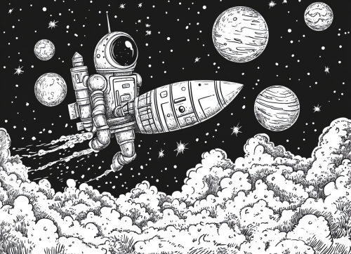 A robot piloting a rocket ship through a starry sky with comets and planets visible in the background, designed as a detailed coloring page. The scene is black and white and thick bold lines, perfect for coloring --ar 11:8 --s 250