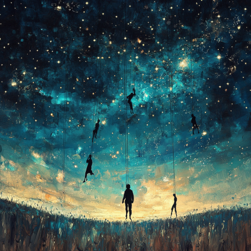 A surreal scene where human figures hang upside down from invisible strings, suspended in a vast, starry night sky, their limbs gently swaying as if weightless, symbolizing a dreamlike state of being caught between worlds, hovering in the delicate balance between reality and imagination. Art Style: Surrealism with Dreamlike Elements