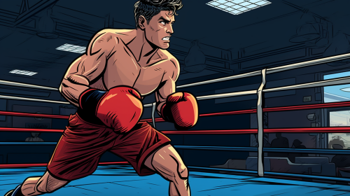 A guy in a boxing ring practices kickboxing. comic book style --ar 16:9