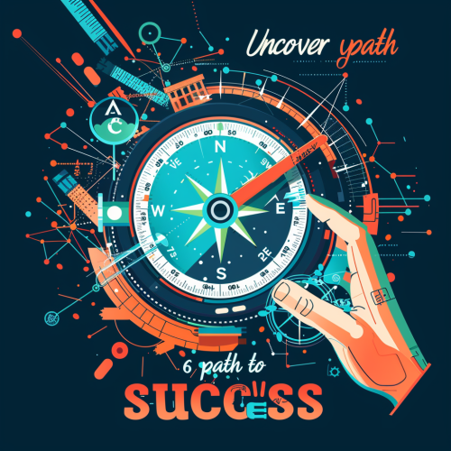 Futuristic stylized compass, with moving pointers, vibrant colors like blue, green and orange, constellation of data and graphs in the background, gears and other mechanical elements, human hand holding the compass, inspirational phrases like "Uncover your path to success" in calligraphic style, minimalist style with touches of surrealism.