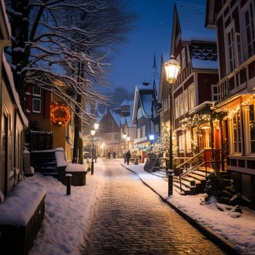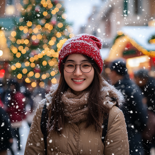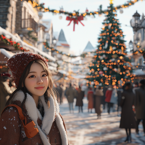Close-Up shot, front view, hyper realistic, winter, afternoon, snowy, korean Solo, European country style, snowy town with Christmas tree, decorations, wide square, festival, lots of people on the street, beautiful fairytale atmosphere, smiling American woman, Canon EOS R5 with a 200mm lens, --style raw --v 6.1 --ar 1:1