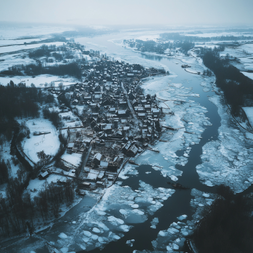 bird's eye view of a medieval village nestled between two merging rivers. Teh river banks are flooded, the water is close to the village's levees. It's a siberian winter and ice shoals are floating on the rivers. Gloomy atmosphere.