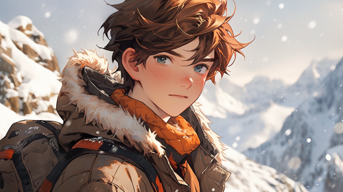 A handsome boy in the winter mountains, brown hair and blue eyes, --ar 16:9 --niji 5