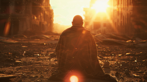 One man, balding elderly man, right eye with golden glow, golden aura, seated in chair with left hand across chin, smiling expression with right corner of mouth upturned, wearing ochre colored robe, 50x50 checkered board in front of elderly man, multiple pyramids of golden light visible behind elderly man's back, semi-photorealistic, frontal view --ar 3:2