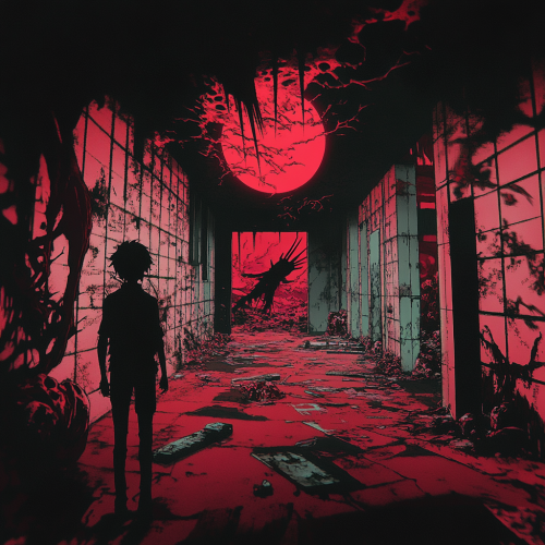 generate an environment in Chainsaw Man anime style, dreamlike space with demonic traits in it, there’s a subject in black clothes in the scenario and all the scenario looks creepy and dreamlike