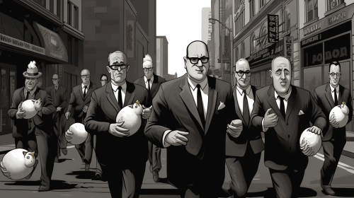 1950s comic book style. Group of egg themed henchmen. Daytime street scene. --ar 16:9