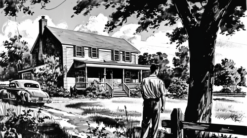 Happy New England man front yard, Archie Comic Style, Comic, Vintage, Retro, style of an Archie comic by Maurice Coyne, printed in 1950s newspaper, --ar 16:9 --v 6.0