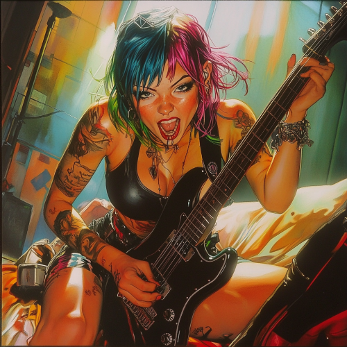 A comic book panel with a punk girl with colourful hair and lots of tattoos and piercings on her bed, pretending to be onstage playing a base guitar. She is on her knees really shredding it and the angle is from underneath as id we are viewing her from the audience. Comic book style full colour in the style of Alex Ross.