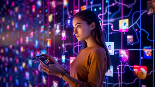 A young beautiful woman interacting with a dynamic array of floating social media icons, medium: digital art, style: modern and sleek. Lighting: ambient, with each icon and the woman emitting a soft glow. Colors: brand-specific hues for each icon, complemented by the woman's contemporary attire. Composition: Canon EOS 5D Mark IV, EF 50mm f/1.4 USM lens, Resolution: 30.4 megapixels, ISO sensitivity: 100, Shutter speed: 1/125 second, capturing the woman reaching out, seemingly manipulating the icons in a 3D digital space. --ar 16:9 --v 5.1 --style raw --s 750