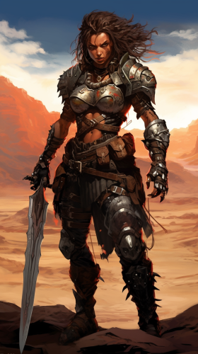 A warrior girl in armor, with well-developed muscles. With short swords.dungeons and dragons concept art, character design, mystic atmosphere, vox machina, critical role --niji 5 --ar 2:3