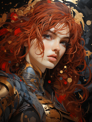 a dark fantasy painting showing a female warrior Red Sonja in the style of marvel comics, cut/ripped, strip painting, dignified poses, close up, lively tableaus, silver and bronze --ar 3:4 --s 750