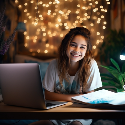 a 12 years girl who is smilling in front of his coputer. Bright room. Girls looks like a funny and handsome artist. Smart girl-programmer. Superealistic photography. Shot on Iphone . Homemade photo.