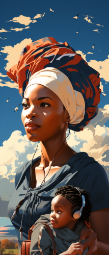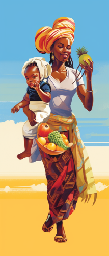 Pop up art style of a young african woman carring her baby on her back and a fruit basket on her head and talking on the phone at the same time, brigt colors, african design clothing, blue sky, happy vibe, full body ilustration, showstopping ilustration by Phathu Nembilwi, asymmetrical --ar 3:7 --s 600 --c 25 --v 5.1
