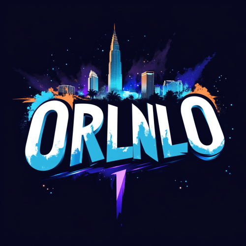 an enclosure sports style logo with the word ORLANDO for a card convention show, highlighting elements of Orlando, trading cards, conversation, and community. Colors should be black, white and blue