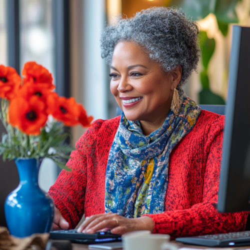 Create an image of two people in a virtual meeting, sitting at their desks with computers, engaging in a supportive conversation. The focus should be on their screens displaying a video call interface, with friendly expressions and collaborative gestures, emphasizing teamwork and communication. The background should be a professional home office setting, conveying a sense of productivity. --ar 1:1 --v 6.1