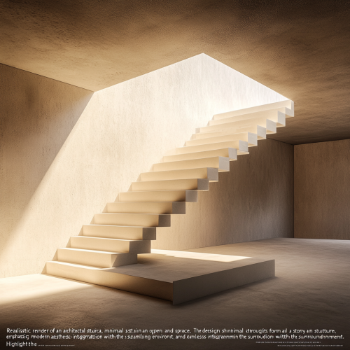 "Realistic render of an architectural staircase in a minimal style, set in an open space. The design should tell a story through its form and structure, emphasizing modern aesthetics and seamless integration with the surrounding environment. Highlight the interplay of light and shadows on the staircase to enhance its visual impact." --v 6.1