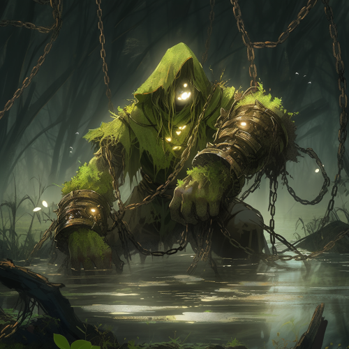 Grimdark mystic otherworldly creepy unsettling swamp yōkai wielding a huge moss-grown chain, anime style, horror fantasy, digital art, masterpiece painting, ultra detailed, ultra high definition, 8K resolution, 3D shading, superior quality, cover illustration, complex design, luminous highlights, rich colours, hyperrealistic, meticulously hyper detailed, high contrast, artstation --niji 5