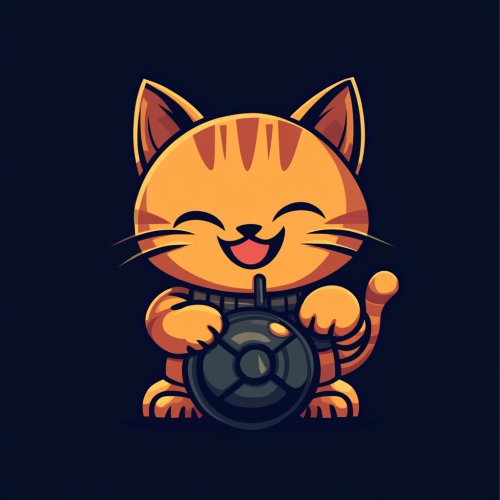 futuristic minimalistic mercenary company logo of a cute kitten with a mischevious expression pulling the pin off a grenade with its teeth, winking and giving the peace sign