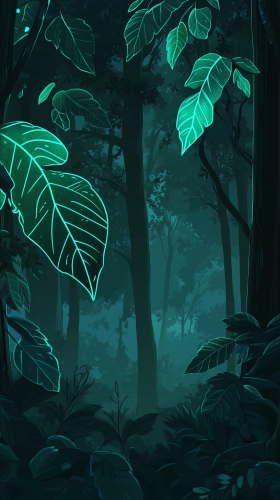 A dark, moody forest scene with deep green foliage, emphasizing the natural process of photosynthesis. The background transitions smoothly from dark gray to black, with faint streaks of neon blue light filtering through the leaves, symbolizing energy conversion. The central focus is on a large leaf, detailed with a subtle neon blue outline, positioned on the left side of the screen. The overall atmosphere is dark and scientific, ensuring that the background does not interfere with the slide's text content and complements the defined style guide. --ar 9:16