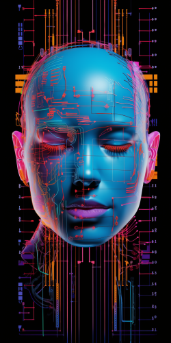 inspiring linear minimalist modern, neon cmyk metrics, central node, cpu chip, multimedia muted naturalistic portrait of complex diagnostics headgear on a test subject, with the number 2 overlay --ar 1:2 --v 5.2