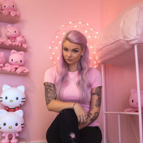 medieval, kawaiipunk, kitty, pink, blonde hair, strong jawline. hour glass, slim waist, Symmetry, proportion, fitness, curves, height, clear skin, and balanced features, smiling sinister proud happy expression by Kiroku Higaki --ar 500:707 --v 6.1