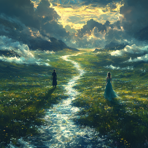 The big wide huge river is divided into two parts. On the left side, there stands an adult man in black , walking along it. To his right, a young woman dressed in a blue-green dress, towards him on a grassy meadow. The sky above them shimmers with soft light. A long, white stream flows between their paths, like a magical road that leads straight ahead. This is a fantasy-style, digital art piece, detailed and beautiful, in high resolution. --s 750