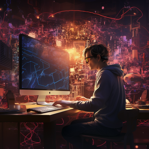 A diagrammatic portrait representation of A diagrammatic portrait of a person intensely focused on a computer screen, surrounded by abstract representations of coding challenges. The background should be a gradient of dark blue and light blue, with no text. The person should be depicted in a thoughtful pose, with elements like code snippets, algorithms, and data structures floating around. Use colors dark blue and white to emphasize the tech theme. --ar 1:1 --quality .5