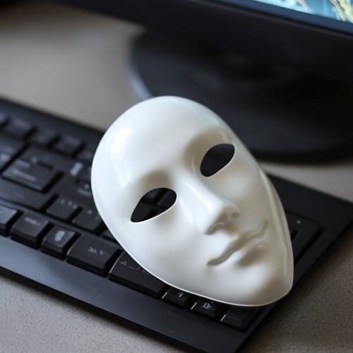 белая маска анонимуса лежит на клавиатуре компьбтераЭ, закрывая часть клавиш, на фоне монитора в котором открыта карта мира /imaginea white mask of an anonymous person lies on the keyboard of a computer, covering some of the keys, against the background of a monitor in which a world map is open --s 50