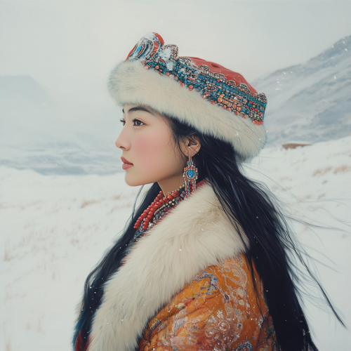 The photograph depicts a young Tibetan woman wearing a traditional fur hat and robe, standing in a snowy landscape. The painting depicts a young Tibetan woman standing in a snowy landscape. She is wearing a small traditional fur hat with a red, white, and blue detail on top, and a long, fur-lined coat. She has long black hair and wears a red necklace with decorative beads. The woman is facing the left side of the photo and looking out over the snow-covered landscape. The background is a scene of a snowy landscape with rippling snowdrifts in the distance. The painting is done in a realistic style, with soft brushstrokes. The colors are muted and somewhat cool, giving the painting a gentle and austere atmosphere. The woman's expression is stoic, perhaps reflecting her tough and independent nature. In the background, the snow-covered landscape is hazy and distant, symbolizing the vast and harsh environment of the Tibetan plateau. The painting's overall mood is one of quiet contemplation and solitude, inviting the viewer to reflect on the resilience and strength of the Tibetan people.