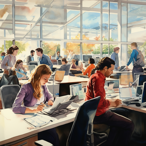 Generate a digital art for A digital art scene showing a project manager overseeing a team working on computers, with a visual representation of software implementation and a graph showing a 20% increase in productivity. Use light gray as the background color. --ar 1:1