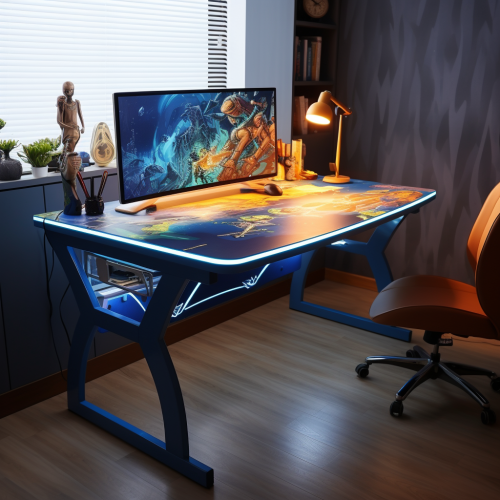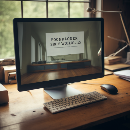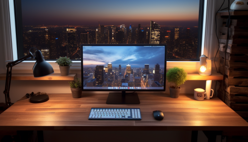 photo of a simple cozy desk setup with a monitor and a large clear wooden desk viewed from slightly above eye level --ar 7:4