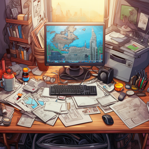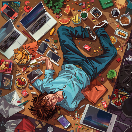 lazy man lying face down on desk with phone in his hands, tablet, laptop, snacks and many other things on the littered desk, 2d graphics --style raw