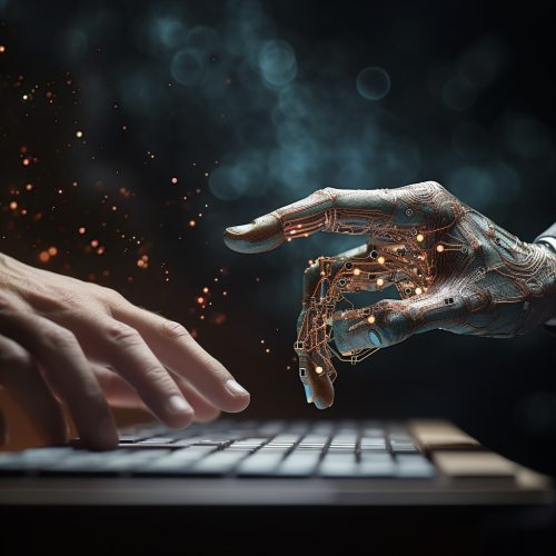 an officeworker, smiling confidently sitting at his desk in a brightly lit mid-century office with lots of windows. He is assisted by 4 holographic transparent AI robots doing work around him. shot on a hasselblad.