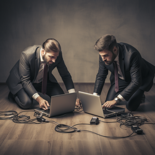 Create an image of two people in a virtual meeting, sitting at their desks with computers, engaging in a supportive conversation. The focus should be on their screens displaying a video call interface, with friendly expressions and collaborative gestures, emphasizing teamwork and communication. The background should be a professional home office setting, conveying a sense of productivity. --ar 1:1 --v 6.1