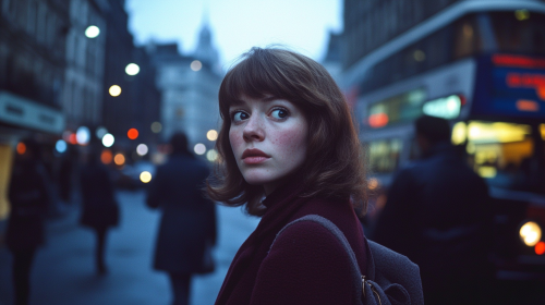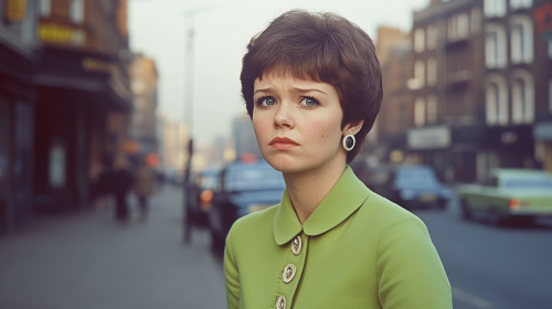 Close-up of a young Judi Dench in 1967 posing for a photographer looking a bit concerned and scared yet trying to be beautiful streets of London at dusk, vivid details,. 1960s styles, clothing and colors, dark stylish shadows and light --ar 16:9 --v 6.1 --style raw --chaos 20