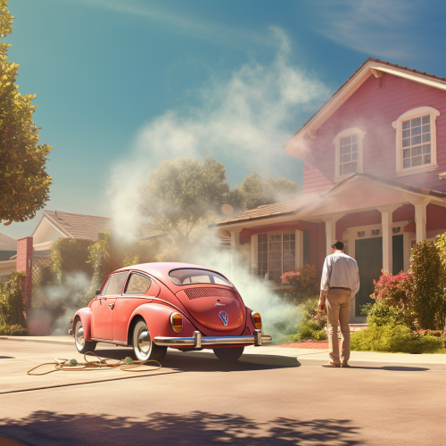 Hyper realistic cinematic Wes Anderson style. A bright sunny day, man is in his driveway with modern car. The car is broken and has Smoke coming out. The man is looking at his car with concern
