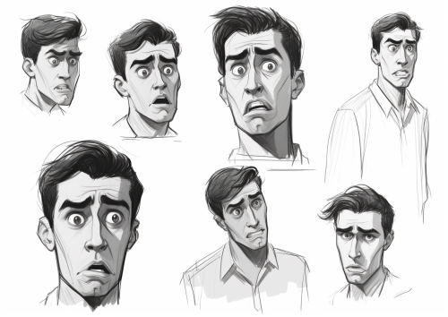 simple storyboard of a man with subtle slightly concerned expressions , black and white, product design sketch, basic storyboard --v 5.2 --ar 7:5