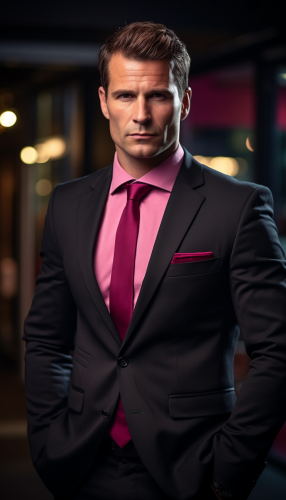 well dressed man in dark suit with fuschia pocket square, facing to the left , looking concerned with arms crossed. He is facing to the left and looking off camera to the left, as if off into the distance, cinematic lighting bokeh --ar 4:7