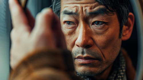 lack and white, photorealistic image of a man, looking to the side, with a concerned expression v 6.0 style raw