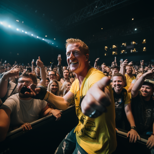 josh homme of the Queens of the Stone Age giving a singular thumbs up to a man in a yellow shirt in the crowd at a rock concert, ultra realism, expressive faces