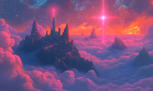a medieval fantasy scape, castles, fog, magical, stars, night, dark atmosphere, neon, airbrushed, 1980s, background art, pink, orange, baby blue --ar 5:3