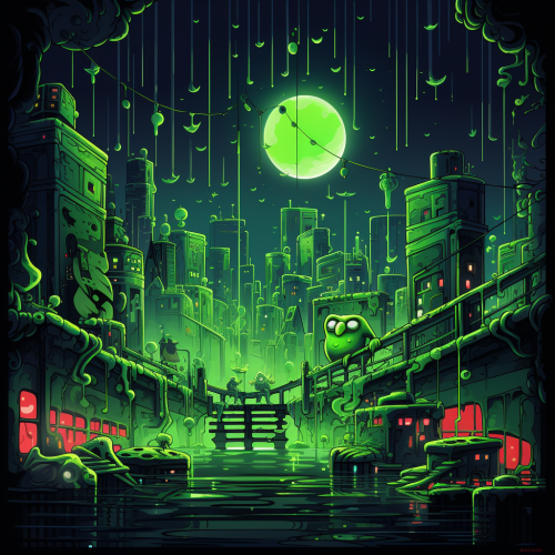 cowboy beep bop style art work city scape, green neon, music notes, green owls
