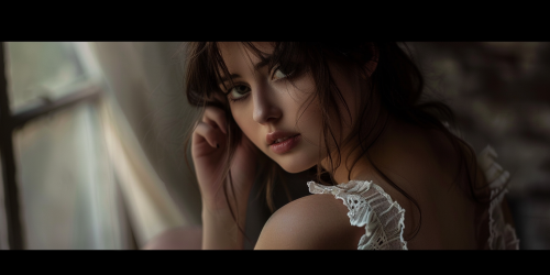 beautiful girl wearing agent provocateur, natural lighting, Nikon D850 105mm, f-stop 1.8, cinematic --ar 2:1