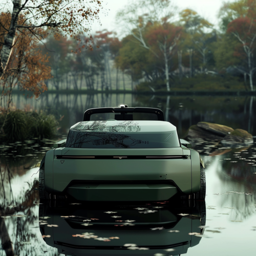 Midjourney Bot BOT — Today at 12:13 AM a small electric dull green amphibious convertible coupe with striking EV design with powerful clean and minimal design language in a lake, press photo cinematic - Image #3 @ACALVA Image --s 50