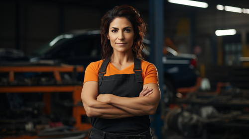 wide portrait of female car mechanic dressed in agent provocateur in a black and orange car in a chaotic vintage cars workshop , beautiful smiling supermodel , confident relaxed, stylish décolletage, curvaceous, lips, teeth. Soft-lighting, 32k-resolution, sharp-focus, ultra-detailed, UHD. --chaos 30 --ar 16:9 --weird 0 --iw 0.4 --v 5.2